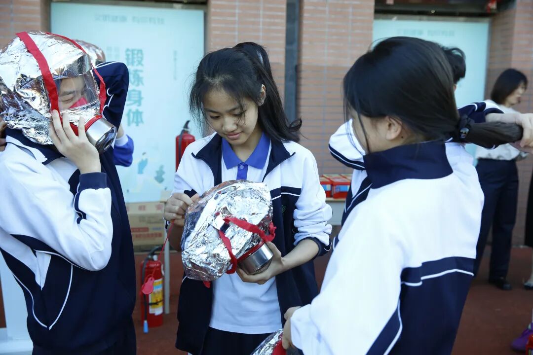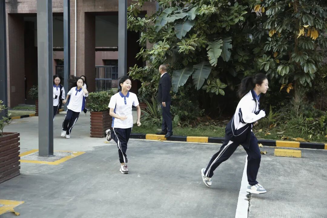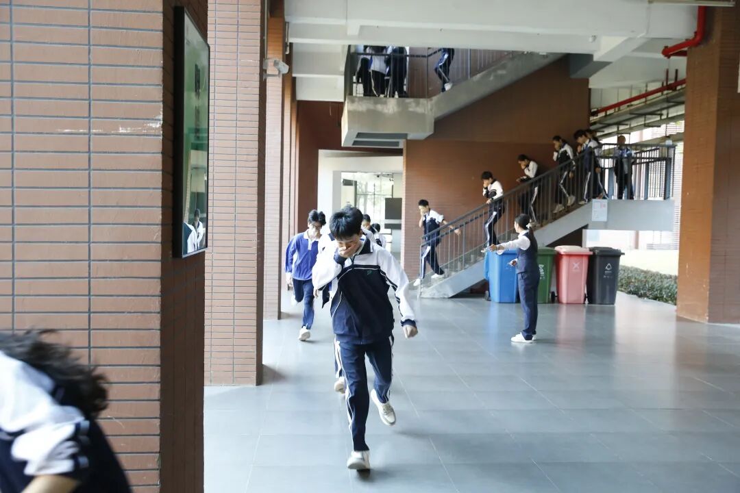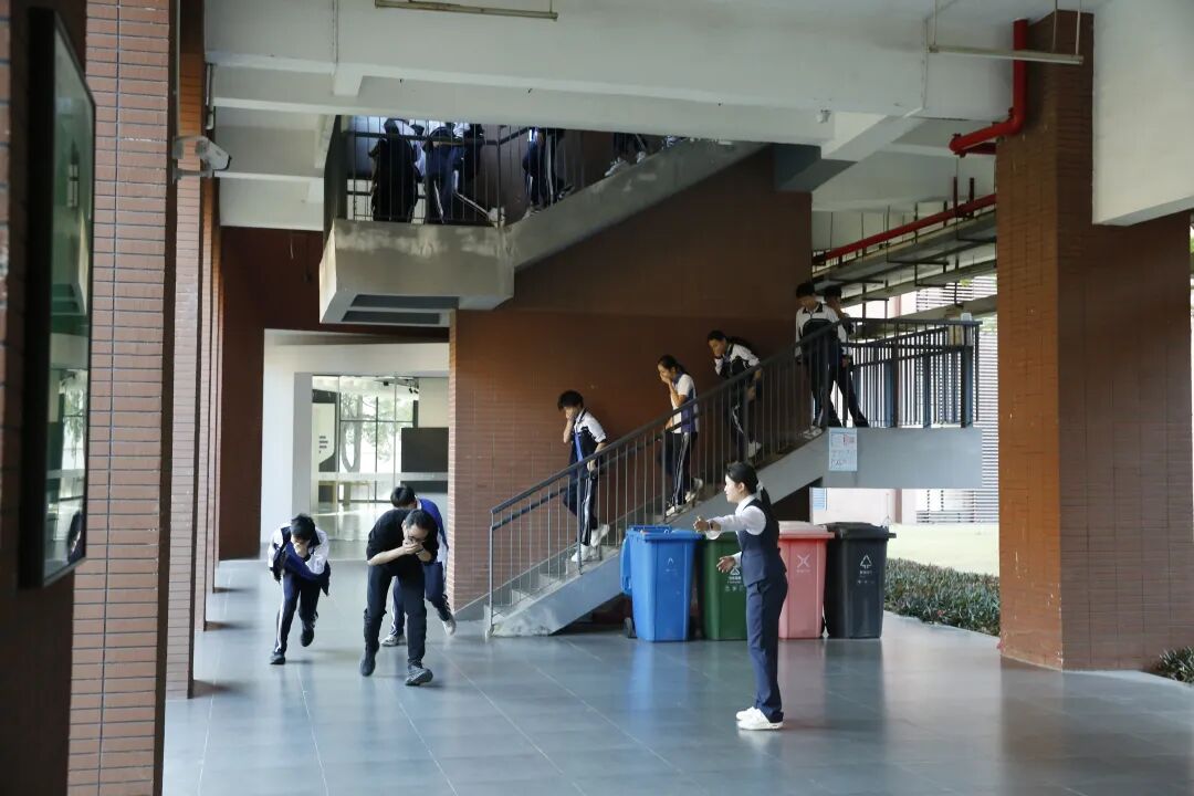 一阵急促的消防警报声骤然响起,全校消防应急疏散演练正式开始!楼层疏导教师立即到位,沉着指挥。同学们迅速用湿毛巾捂住口鼻,弯腰低姿,按照预定的疏散路线,快速、有序地从教学楼撤离到学校操场的安全区域。整个演练过程紧张有序、分工明确、配合顺畅,参演师生全部安全撤离,达到了预期效果。