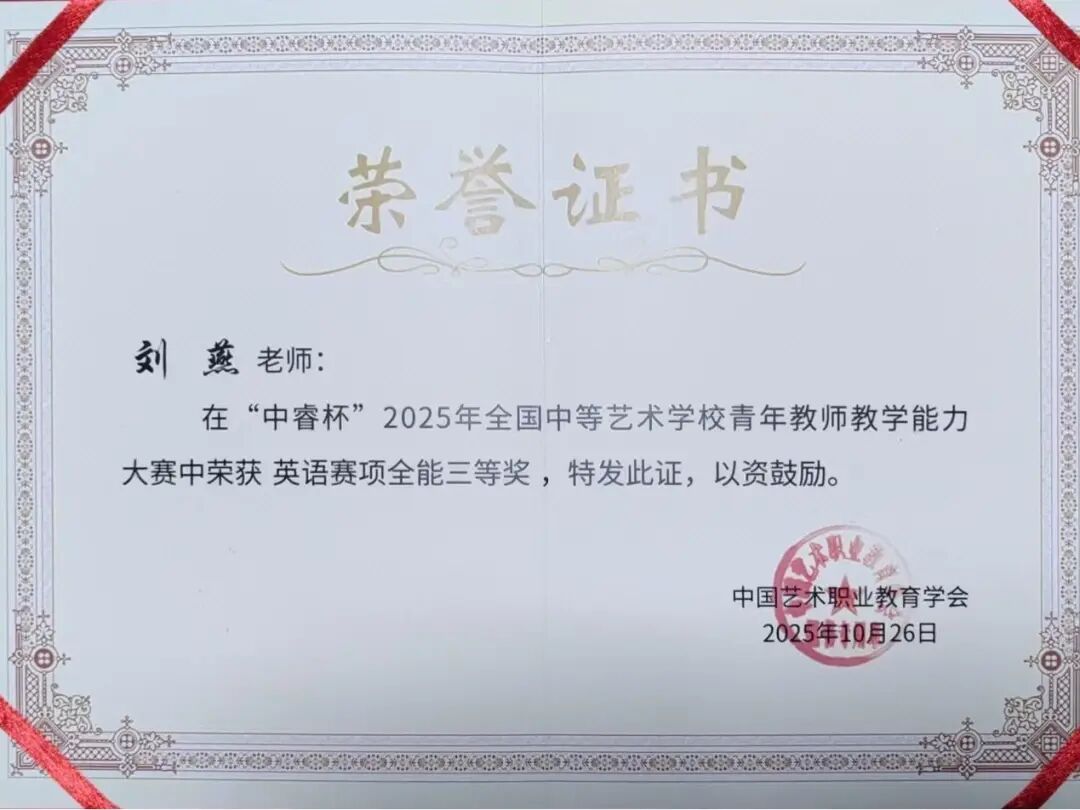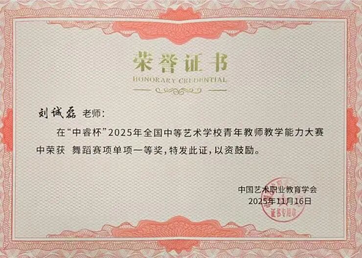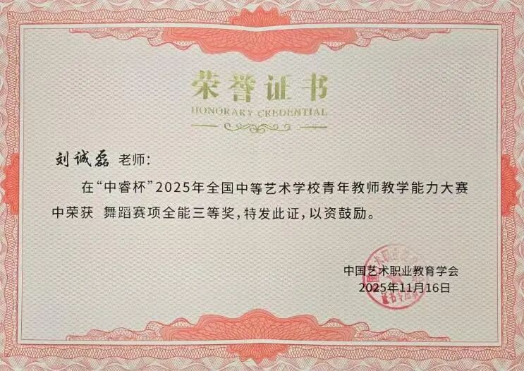 今年,我校选派了舞蹈学科刘诚磊老师和文化课刘燕老师参加了2025年“中睿杯“全国中等艺术学校青年教师教学能力比赛,收获了优异成绩。