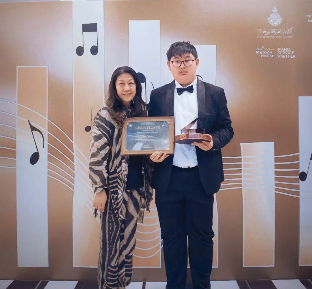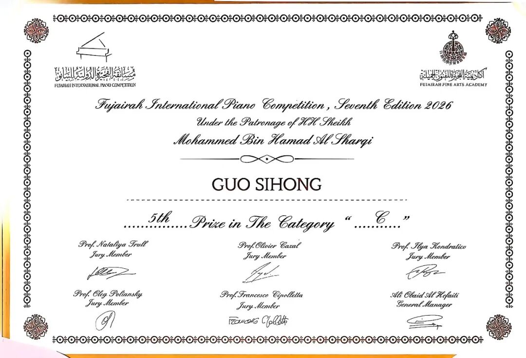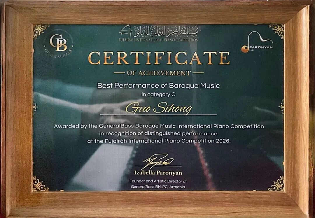 2026年1月26日至2月7日,为期13天的第七届富查伊拉国际钢琴比赛在阿联酋文化名城富查伊拉圆满落幕,该赛事是中东地区规模与影响力首屈一指的国际钢琴赛事,备受业界高度认可与广泛关注。我校初三年级郭思宏同学(指导教师:陈兰)与高一年级黄睿宇同学(指导教师:金胜)历经多轮高强度竞技,双双晋级全球总决赛,其中郭思宏同学作为14-17岁C 组年龄最小的参赛者,面对来自全球的顶尖选手与国际权威评委团,最终荣获C组第五名,并一举摘得该组别唯一评委会大奖——“巴洛克音乐最佳表演奖”。