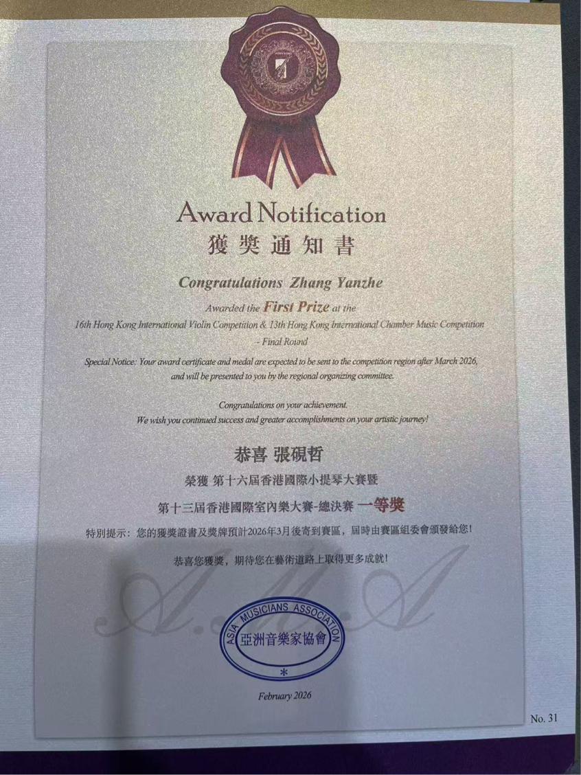 2026年2月6日,第十六届香港国际小提琴大赛暨第十三届国际室内乐大赛总决赛落下帷幕。本届大赛盛况空前,吸引了粤港澳地区逾3000名选手参赛,竞争异常激烈。我校初二年级张砚哲同学(指导教师:任妮莎)在众多选手中拔得头筹,荣获独奏专业少年组一等奖。