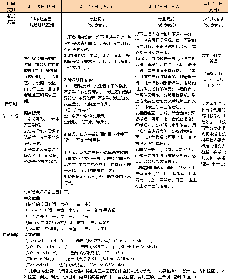 (3)中国舞、芭蕾舞、音乐剧专业考试时间安排